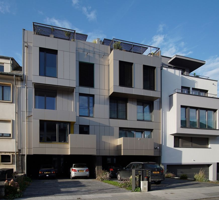 De l’extérieur les deux résidences enveloppées de cassettes en Alu semblent comme un ensemble. Le ton des cassettes en Alu change en fonction des conditions météorologiques et des saisons; un jour la façade semble plus grise, l’autre jour plus « champagne » ou dorée, tout en harmonisant avec le contexte bâti existant. Ces cassettes de dimensions régulières rythment les façades de manière à calmer l’apparence globale. Les garde-corps des balcons sur rue des niveaux inférieurs sont exécutés en opaque avec lesdites cassettes pour assurer la sphère privée des habitants, par contre les terrasses des étages en retrait et des balcons vers l’arrière sont bordées par des garde-corps en filet inox pour profiter des vues jusqu’aux champs de Leudelange.