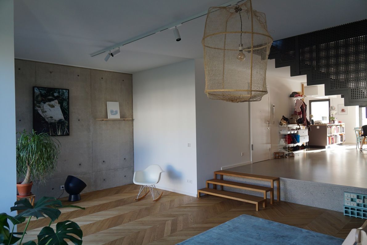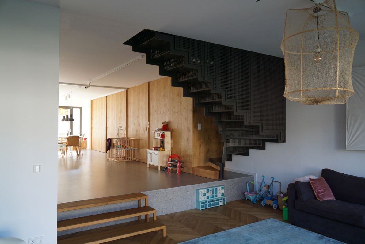 Chacune des cinq habitations duplex est exécutée avec des matériaux de grande qualité et des meubles sur mesure, et de plus elles profitent de balcons et/ou terrasses généreuses, ou même de jardins, ce qui augmente encore la qualité de vie des habitants. Comme les bâtiments sont assez profonds (15-17m), les espaces de vie sont aménagés de sorte transparente et même traversant pour trois des cinq logements avec des hauteurs libres sous plafond généreuses, pour amener le plus possible de lumière naturelle jusqu’à l’intérieur.